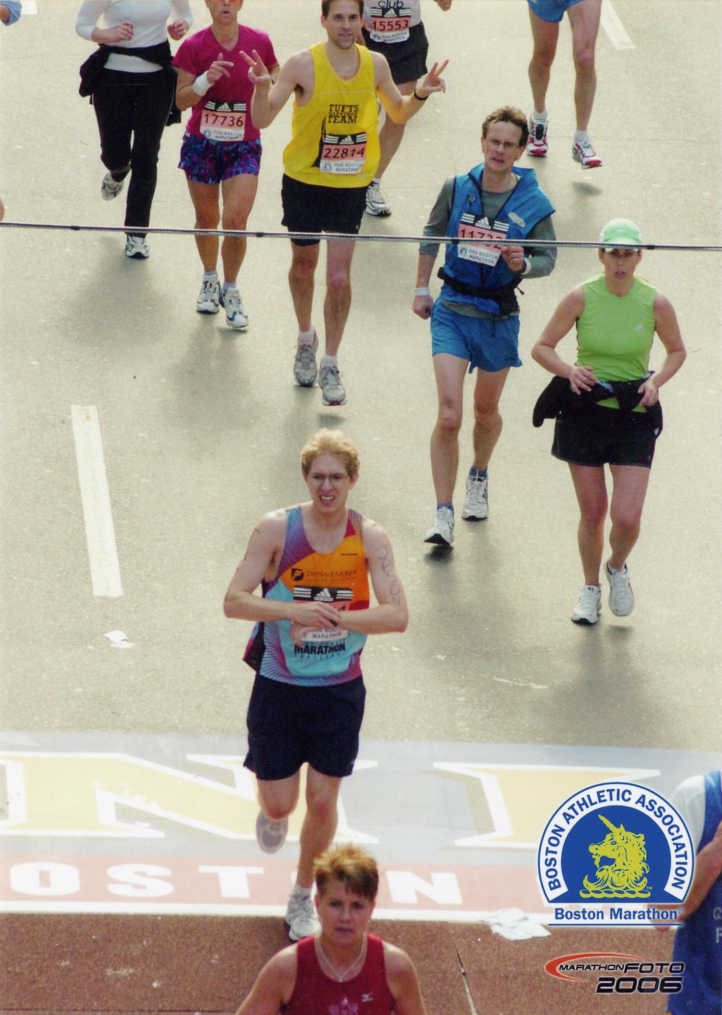 The official photo of me crossing the finish line at the end of the 2006 Boston Marathon. You can see me stopping my stop watch, and the look of anguish on my face from all the pain I just endured.