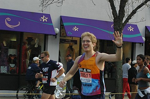This photo of me was taken by my cousin David Lowe when I ran by him and his mother. They were standing near Summit Ave. on Beacon St., which is just before Mile 24 of the course. My legs were in a lot of pain, but I could still manage a smile and a wave.