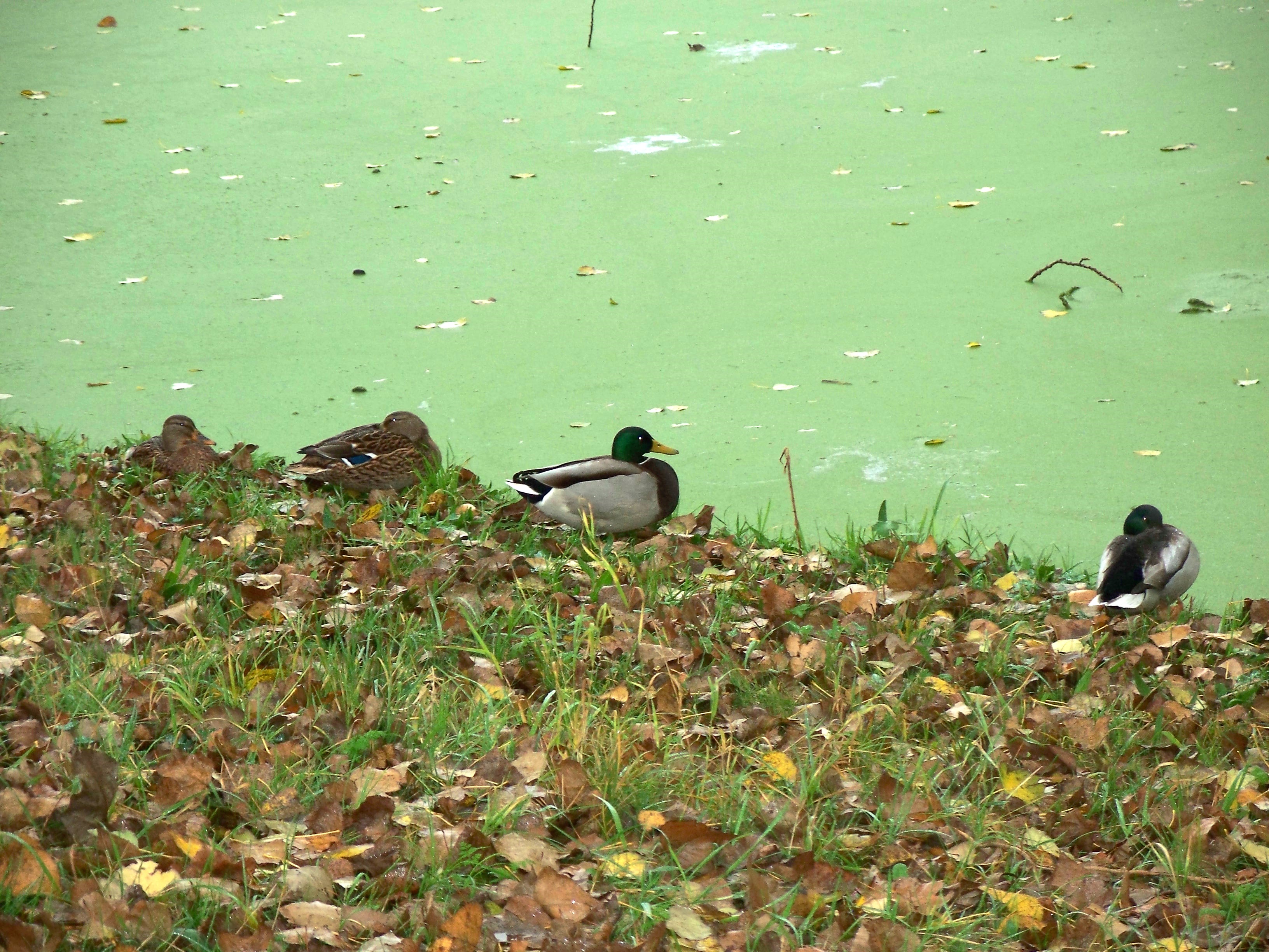 Ducks resting near an algae covered ditch
