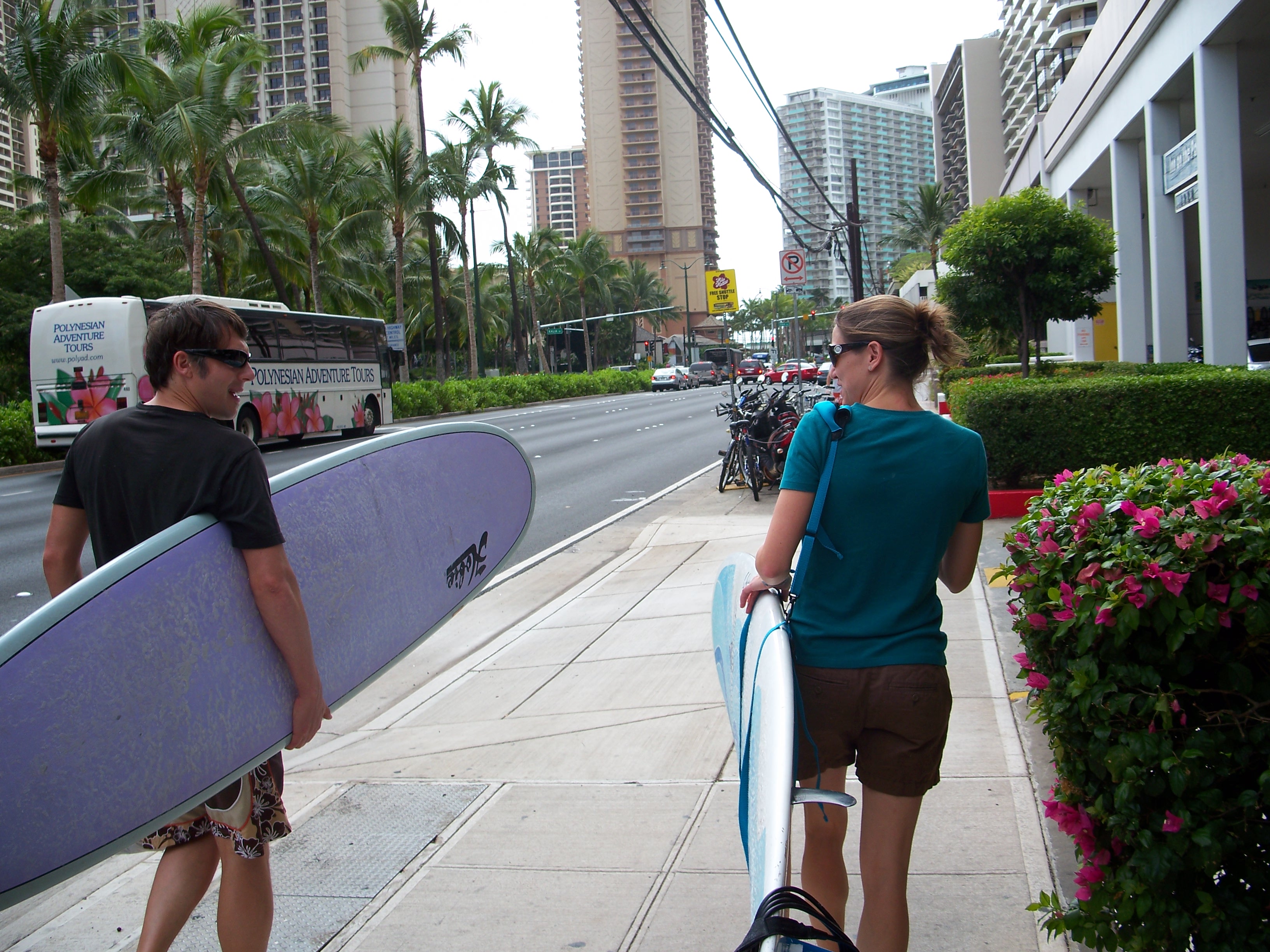 Josh and Heather are ready for some Waikiki surfing