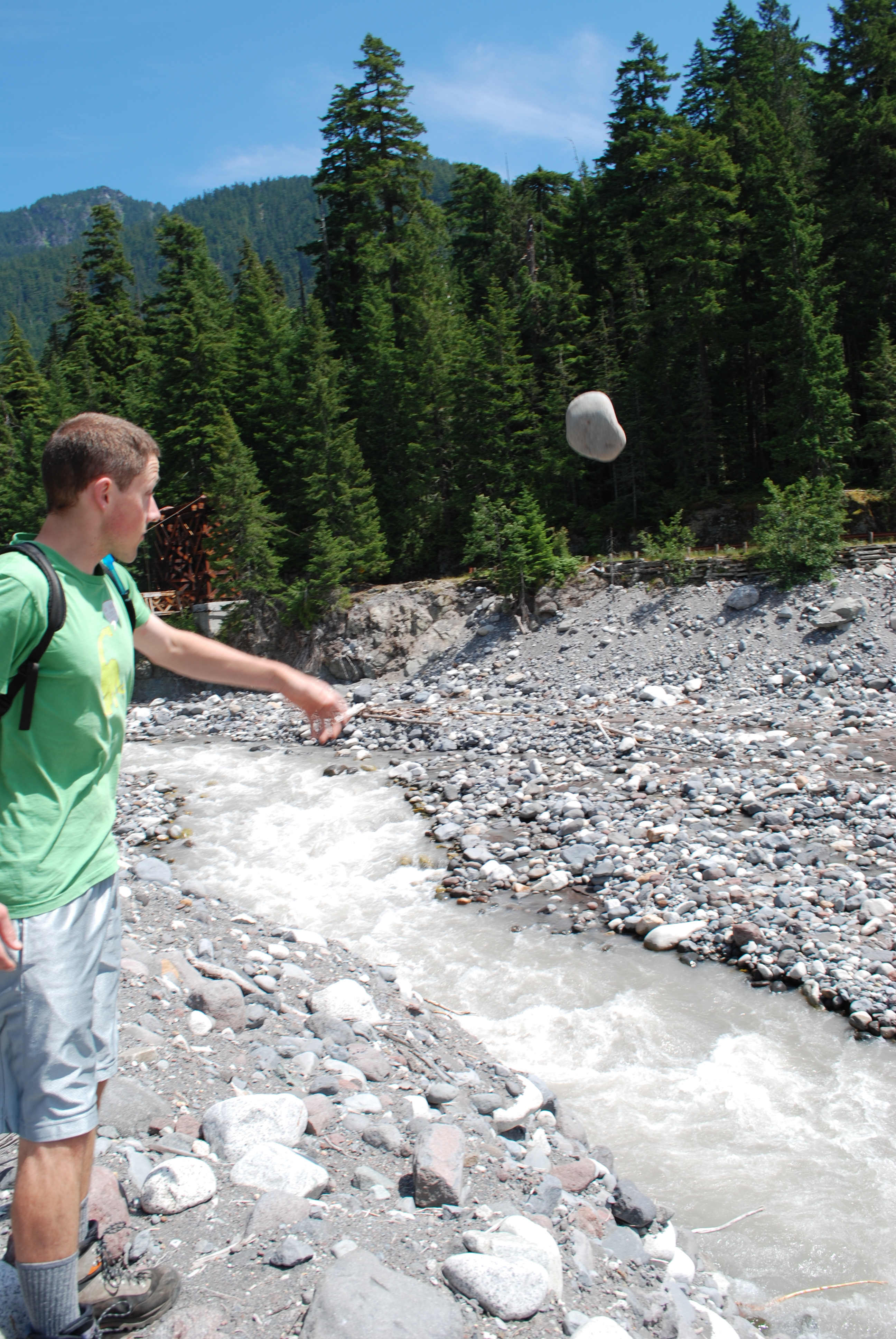 Joe tries to start a rock slide into the river