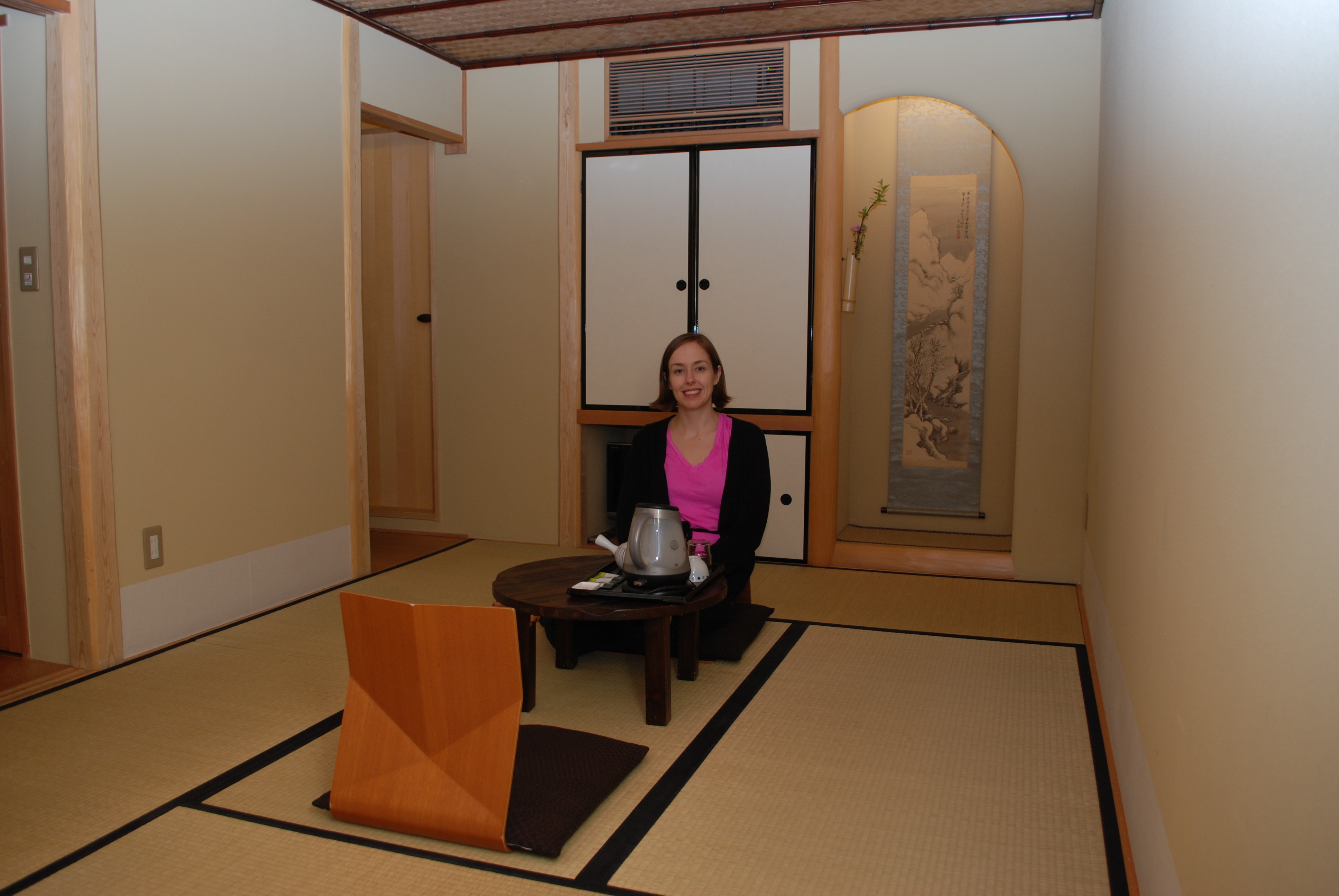 Katie in our room at the Ryokan Sakura (Japanese Inn)