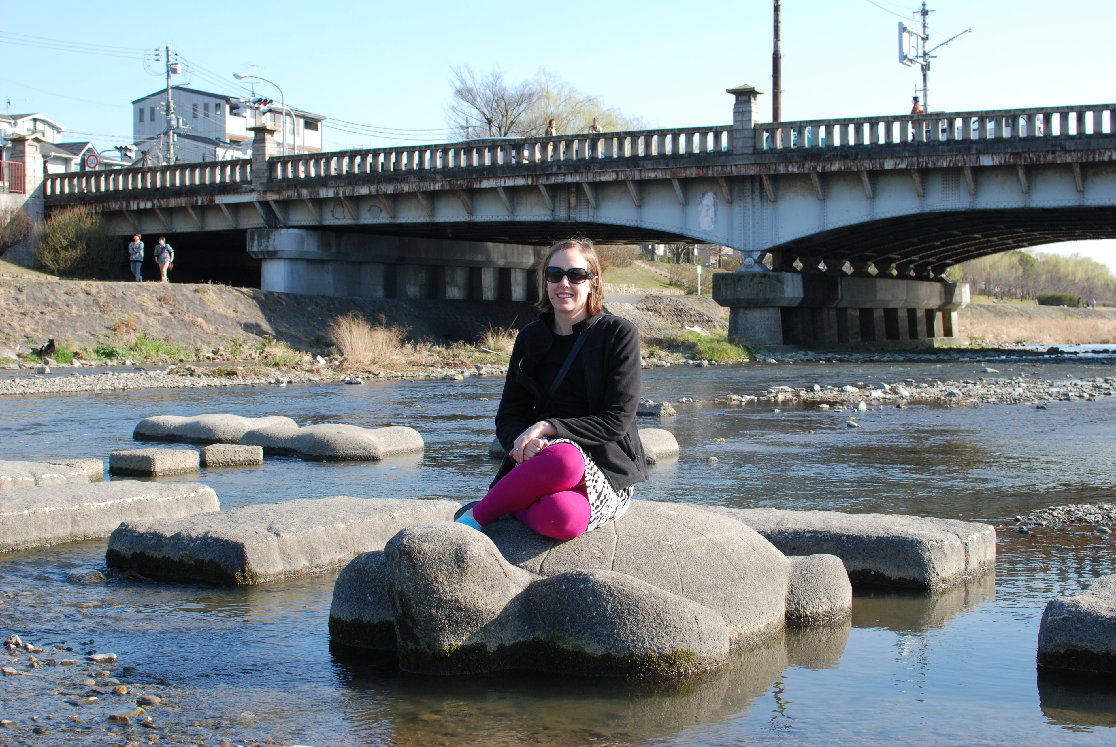 Katie resting on a turtle in the river