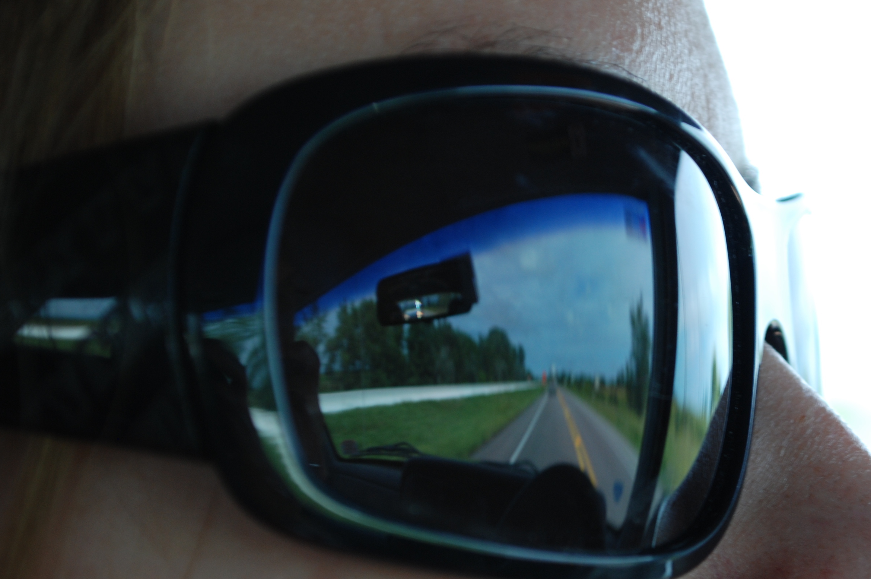 The highway, reflected in Katie's sunglasses