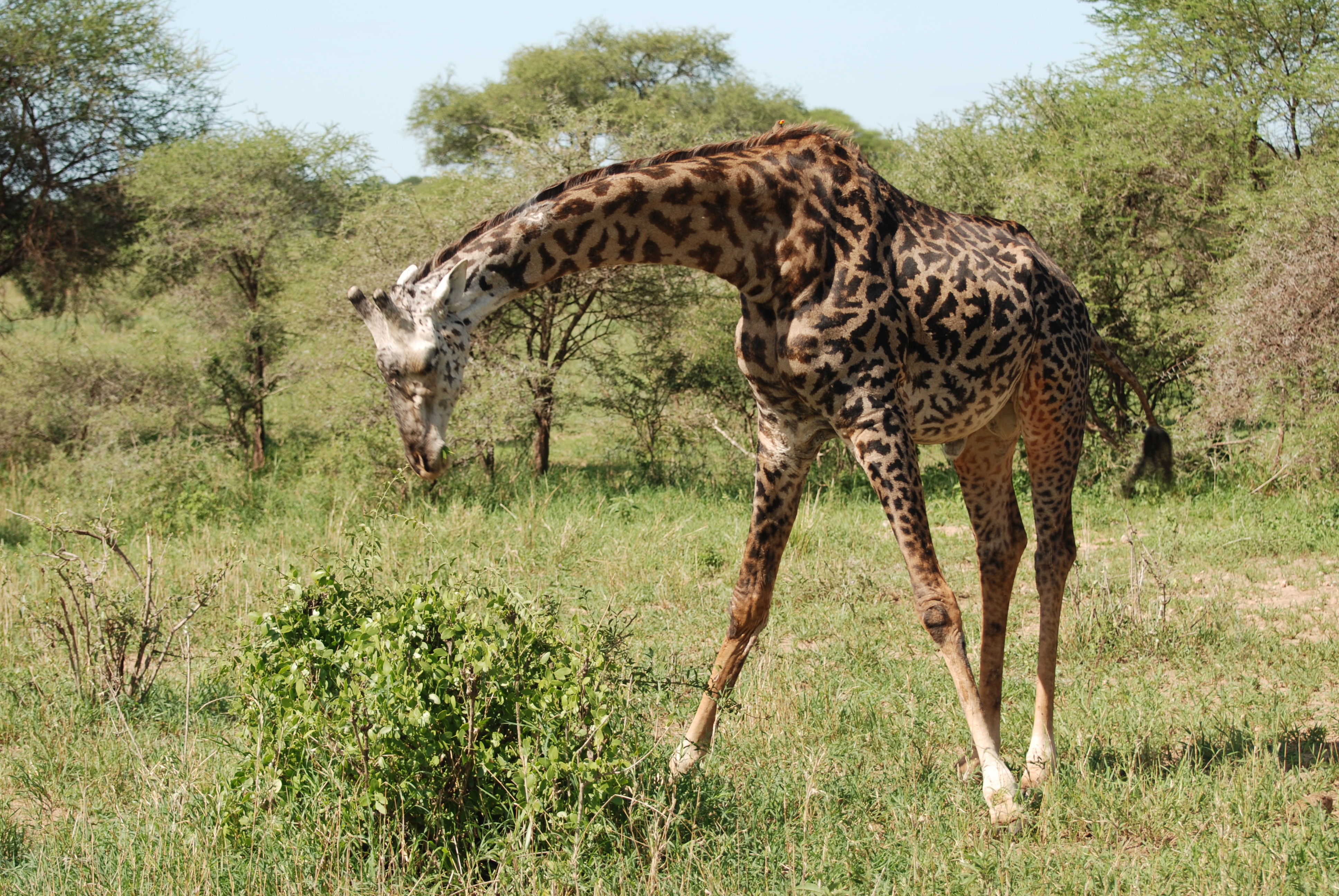 Giraffe spreading its legs to reach a low shrub