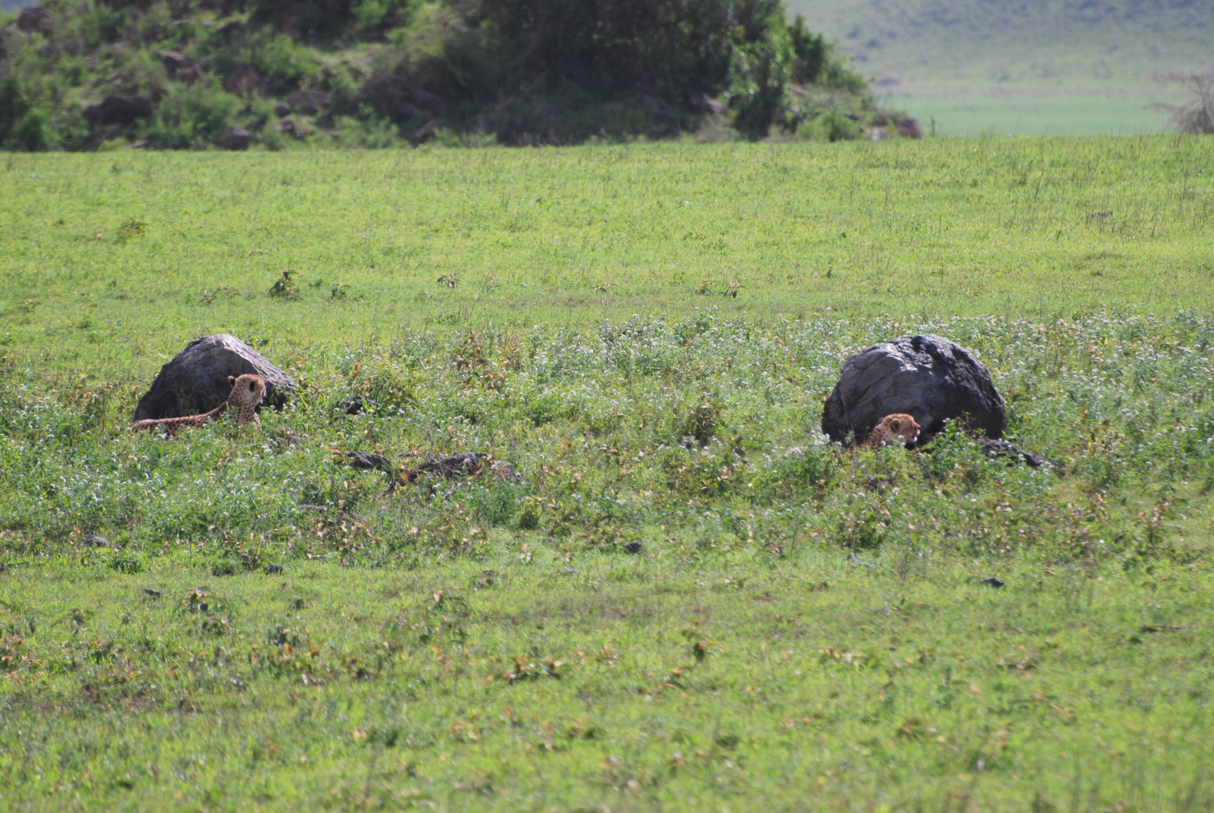 Two cheetahs resting against the rocks