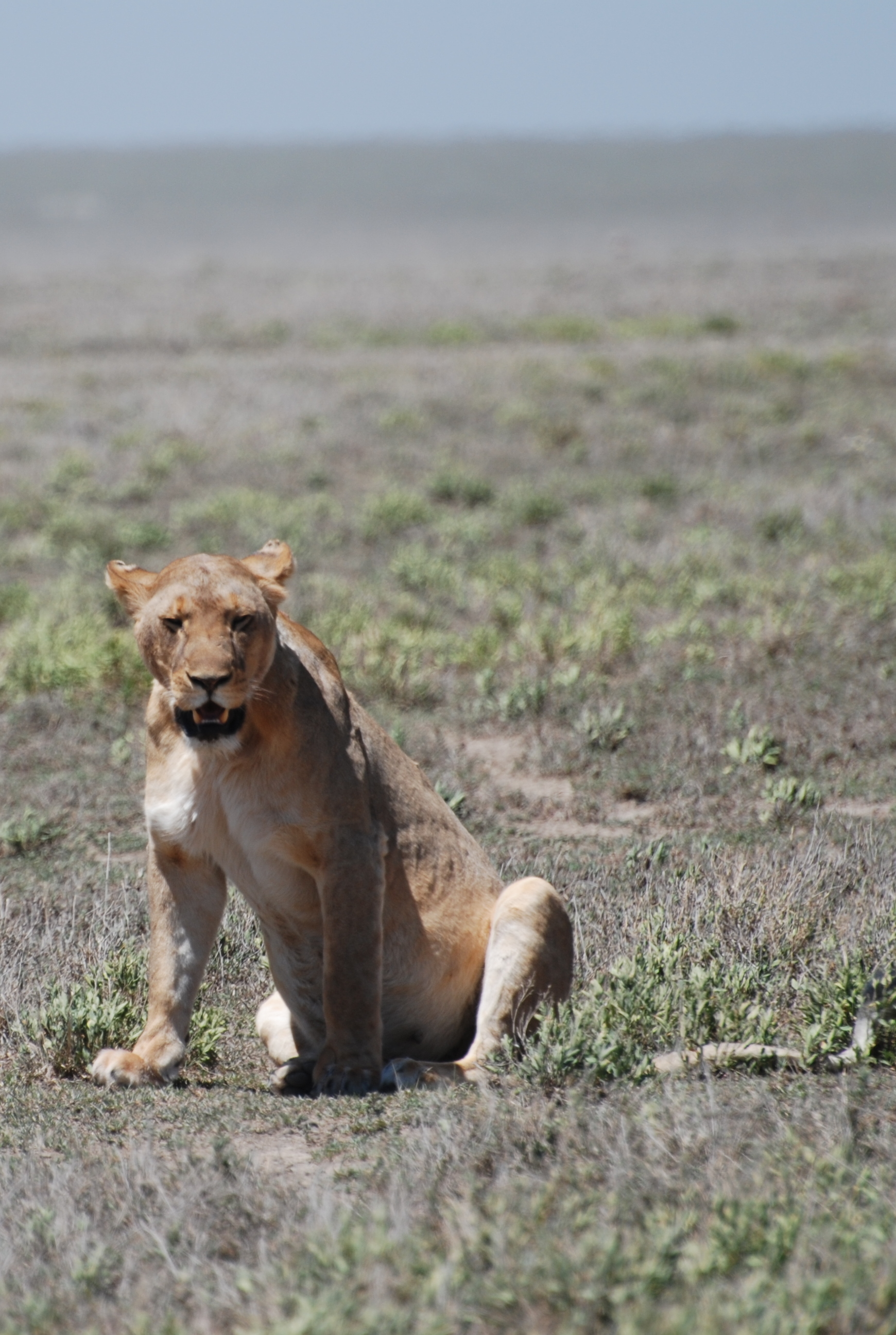 Female lion sitting down to watch us